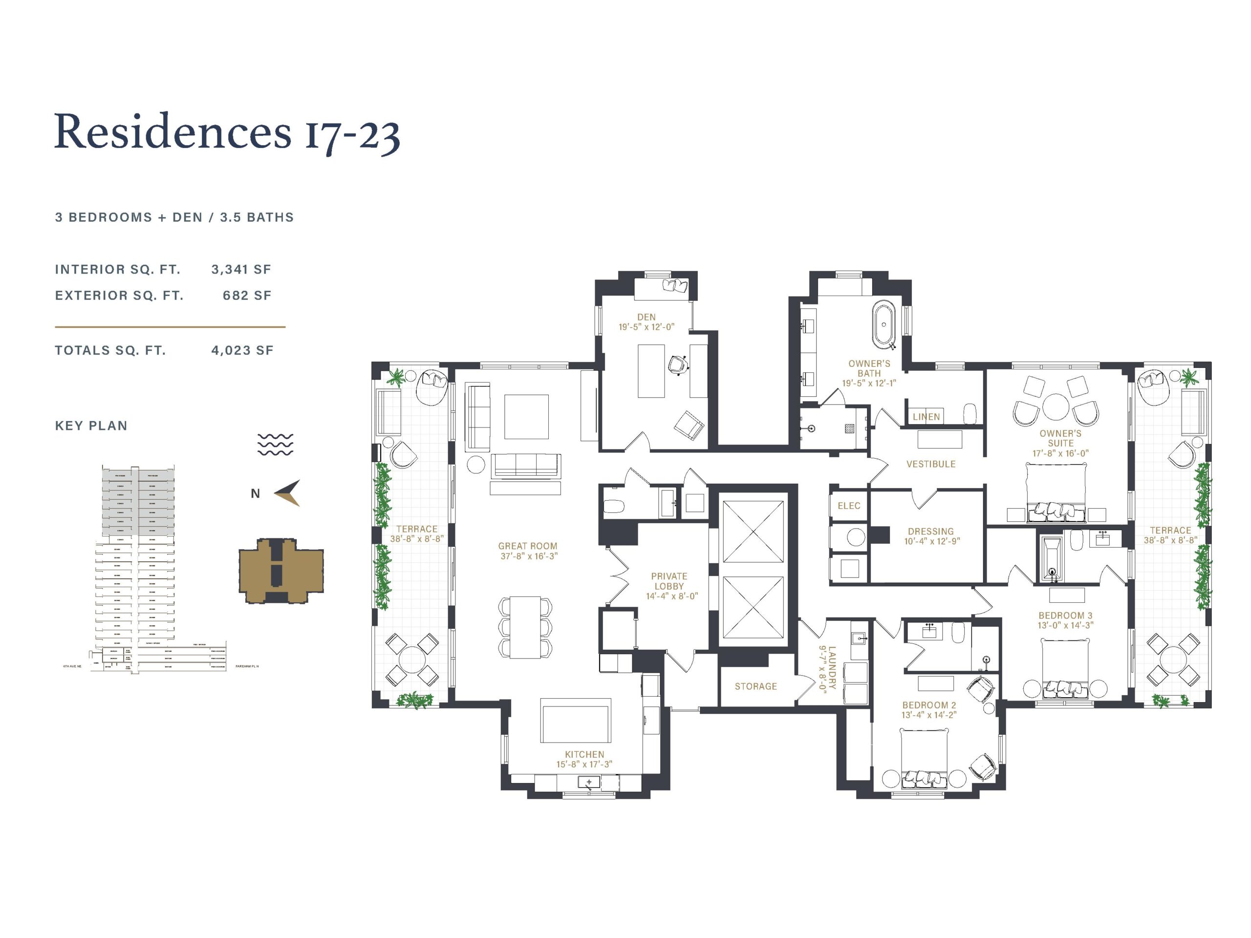 Floors 16–23: Full-floor residences spanning 3,400 sq. ft. with 3 bedrooms plus den and 3.5 bathrooms. These premium homes provide unobstructed panoramic views over Bliss, the bay, and the city skyline.